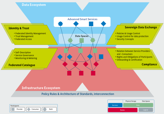 Pohled na architekturu GAIA-X ukazuje hlavní prvky architektury a funkcí doprovázených sdruženými službami.